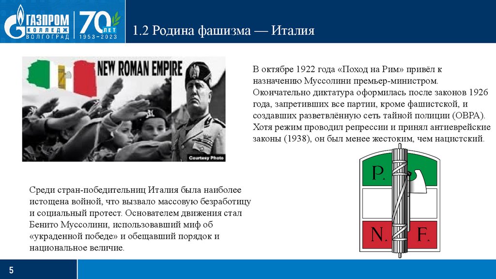 1.2 Родина фашизма — ИталияВ октябре 1922 года «Поход на Рим» привёл к