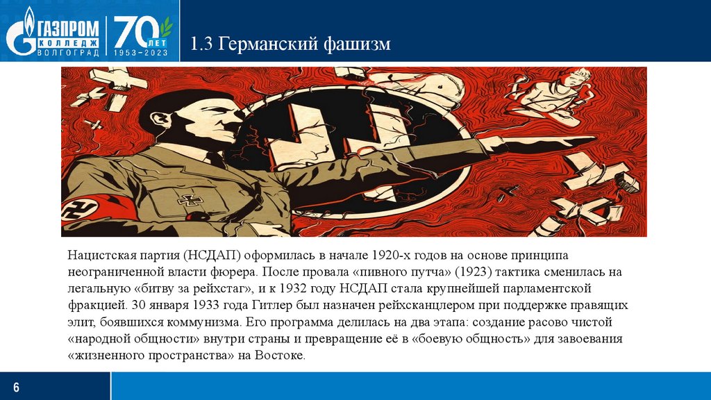 1.3 Германский фашизмНацистская партия (НСДАП) оформилась в начале 1920-х годов на основе принципа
