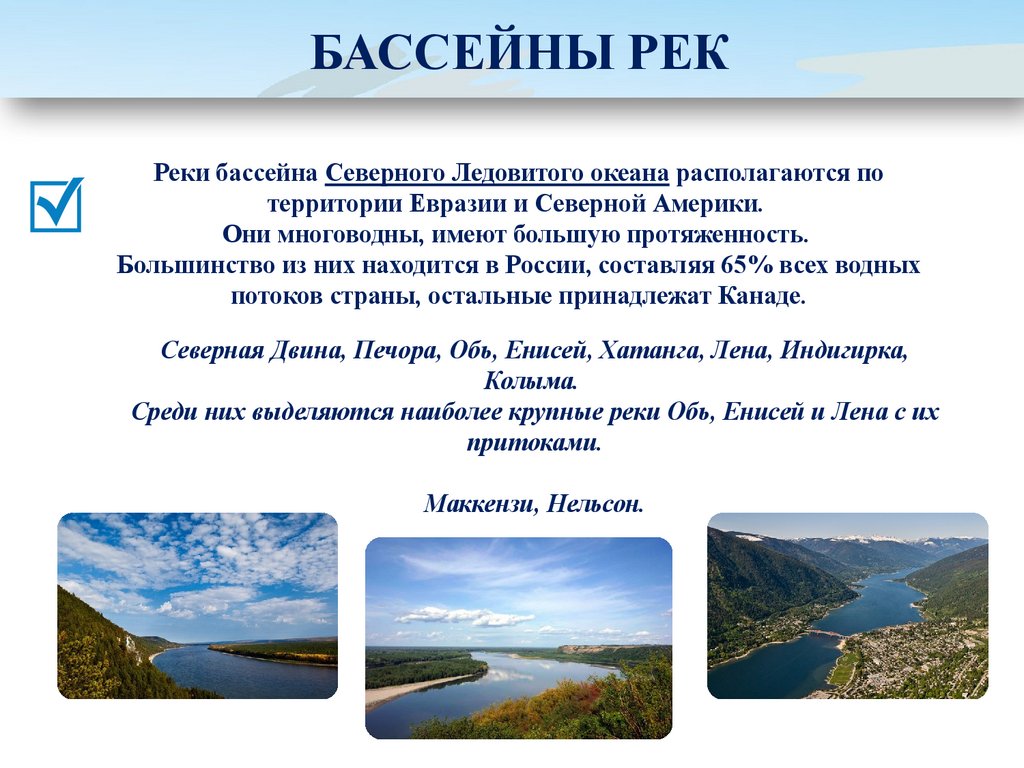 БАССЕЙНЫ РЕКРеки бассейна Северного Ледовитого океана располагаются по
