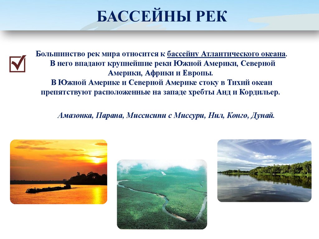 БАССЕЙНЫ РЕКБольшинство рек мира относится к бассейну Атлантического океана.