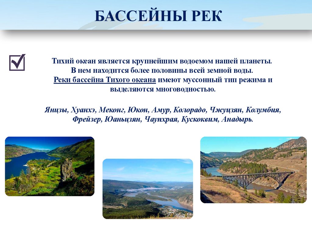БАССЕЙНЫ РЕКТихий океан является крупнейшим водоемом нашей планеты.