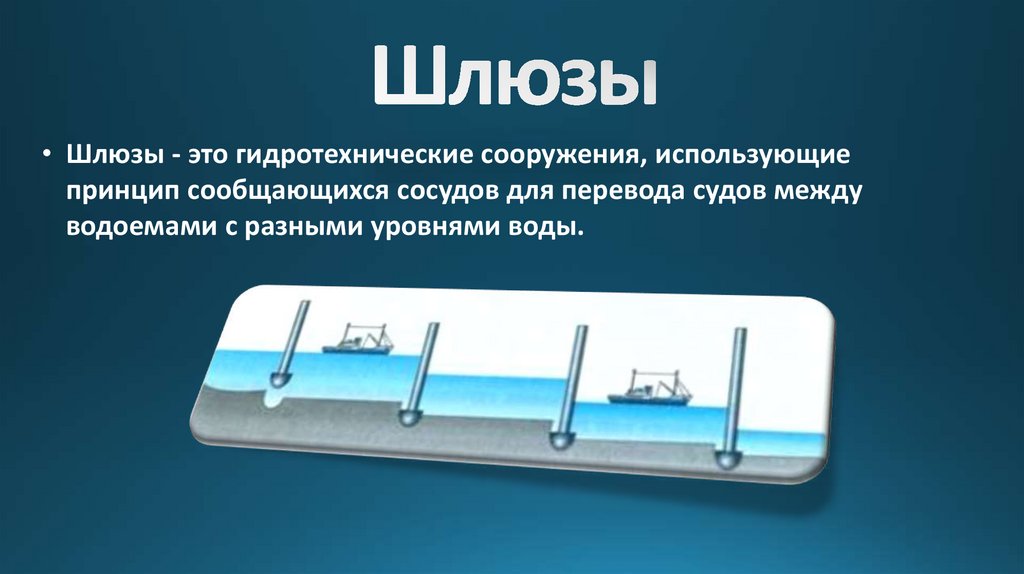 • Шлюзы - это гидротехнические сооружения, использующиепринцип сообщающихся сосудов для перевода судов между