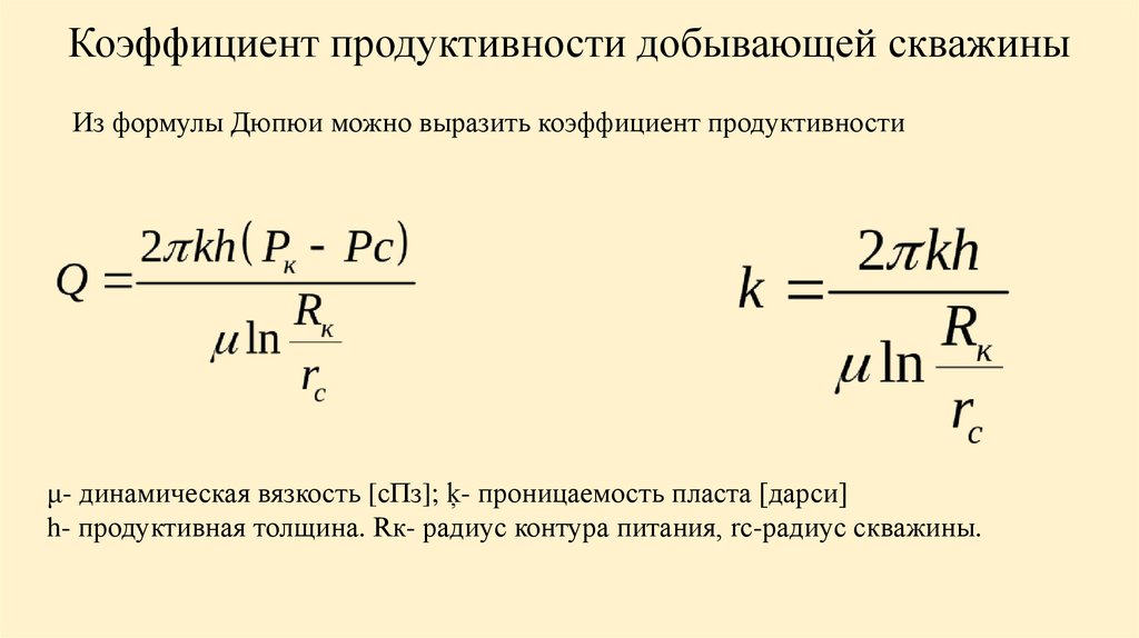 Коэффициент продуктивности добывающей скважиныИз формулы Дюпюи можно выразить коэффициент продуктивности