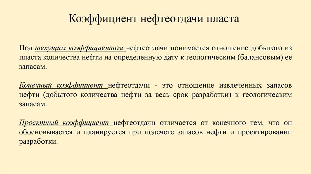 Под текущим коэффициентом нефтеотдачи понимается отношение добытого изпласта количества нефти на определенную дату к геологическим (балансовым) ее