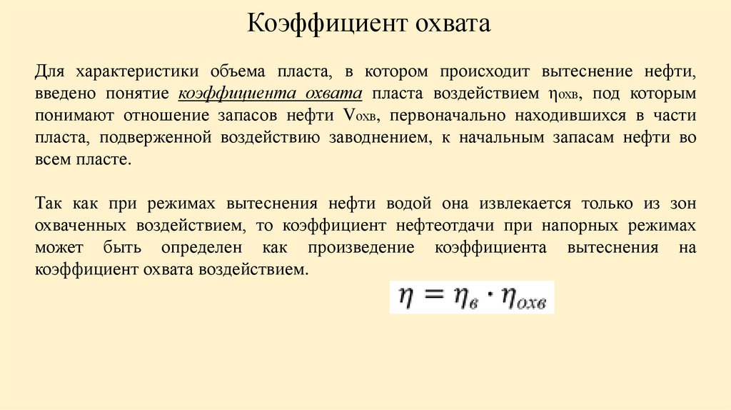 Коэффициент охватаДля характеристики объема пласта, в котором происходит вытеснение нефти,
