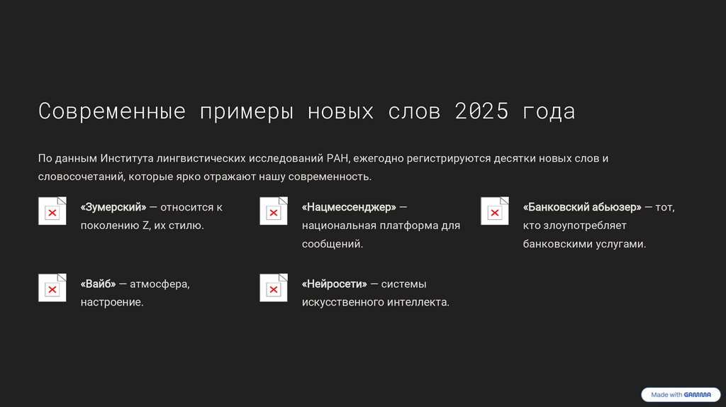Современные примеры новых слов 2025 годаПо данным Института лингвистических исследований РАН, ежегодно регистрируются десятки новых слов и