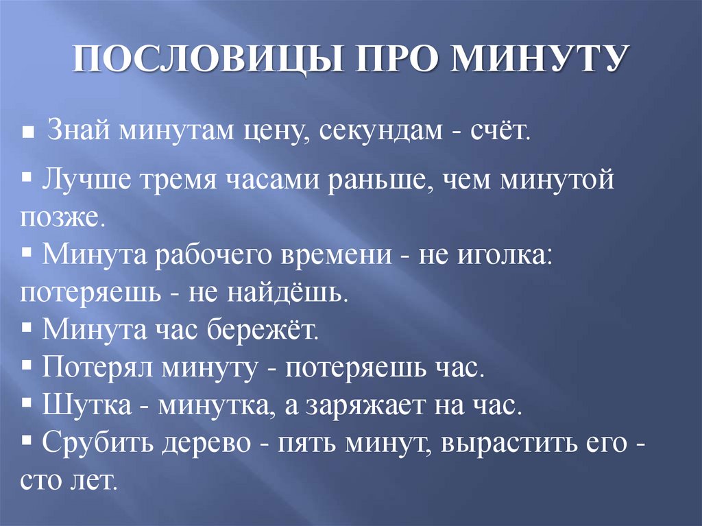 ПОСЛОВИЦЫ ПРО МИНУТУЗнай минутам цену, секундам - счёт.