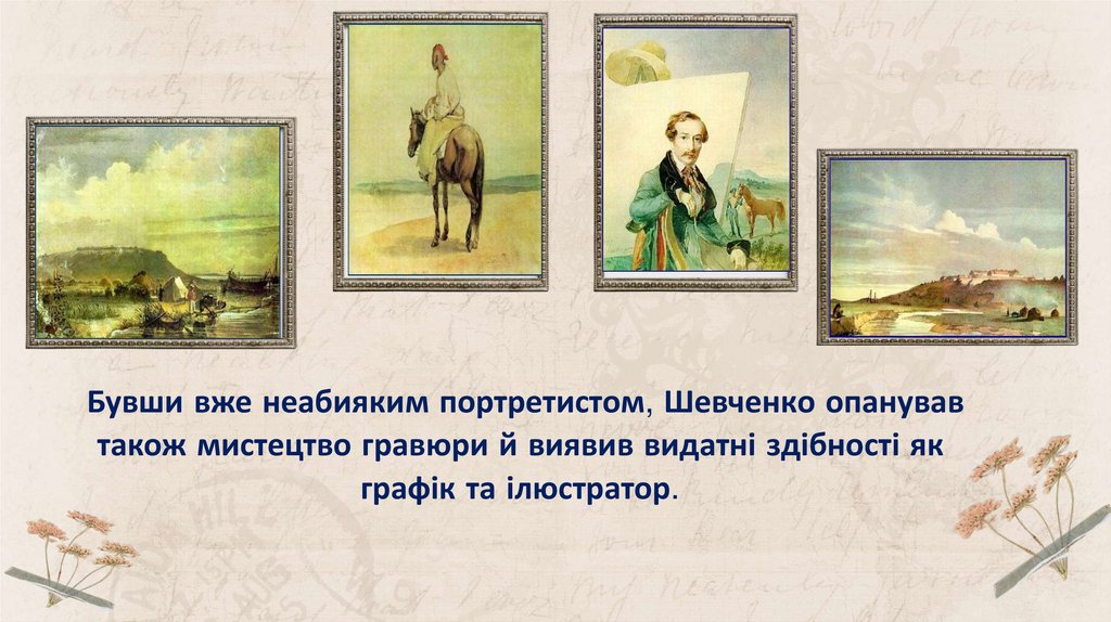 Бувши вже неабияким портретистом, Шевченко опанувавтакож мистецтво гравюри й виявив видатні здібності як