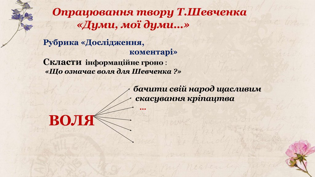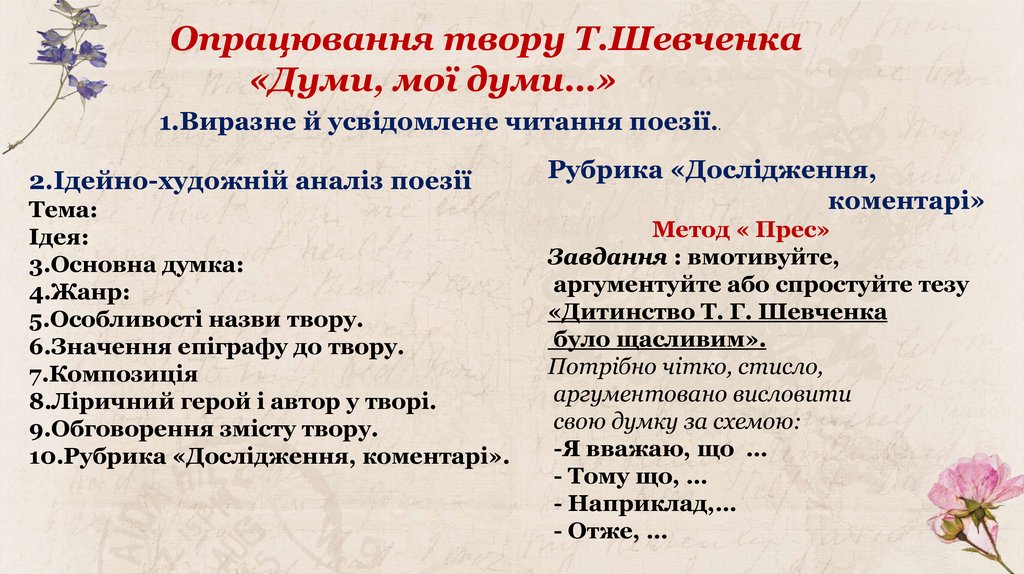 Опрацювання твору Т.Шевченка«Думи, мої думи…»