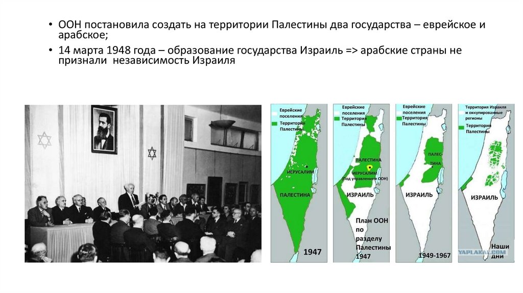 • ООН постановила создать на территории Палестины два государства – еврейское иарабское;