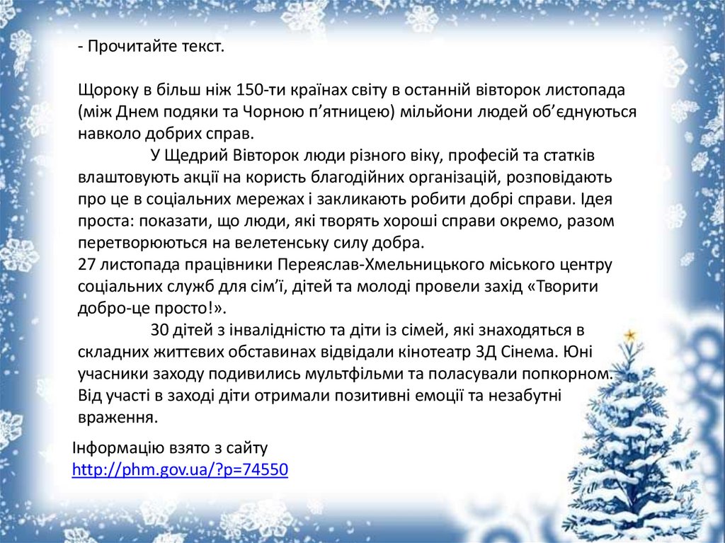 - Прочитайте текст.Щороку в більш ніж 150-ти країнах світу в останній вівторок листопада