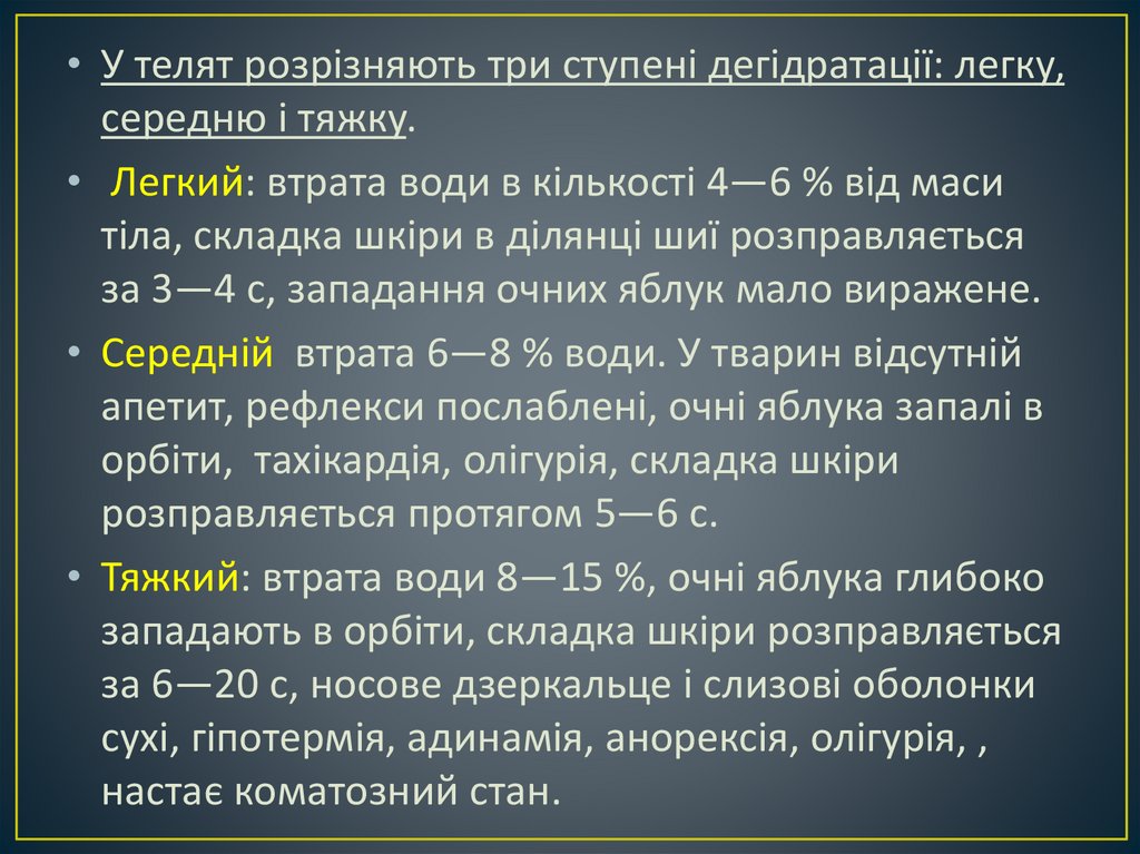 • У телят розрізняють три ступені дегідратації: легку,середню і тяжку.