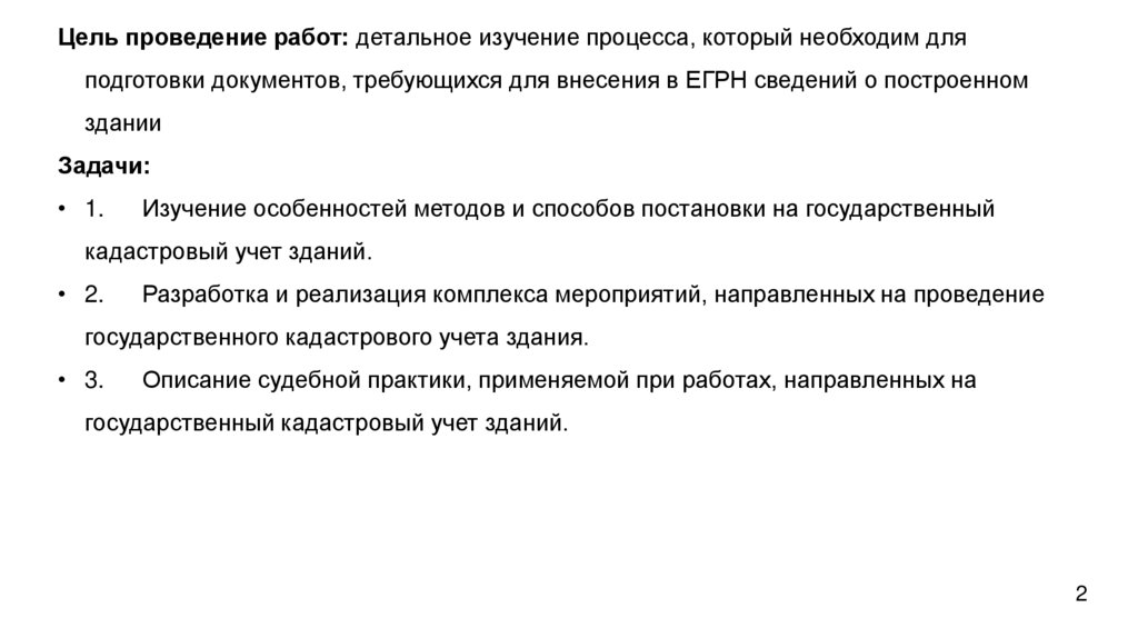 Цель проведение работ: детальное изучение процесса, который необходим дляподготовки документов, требующихся для внесения в ЕГРН сведений о построенном