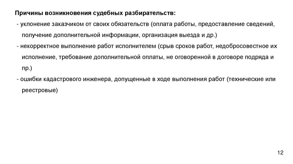 Причины возникновения судебных разбирательств:- уклонение заказчиком от своих обязательств (оплата работы, предоставление сведений,
