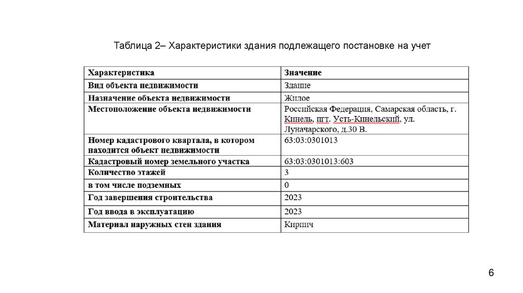 Таблица 2– Характеристики здания подлежащего постановке на учет6