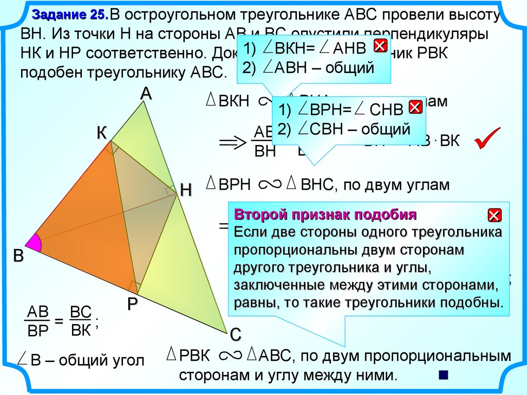 Задание 25. В остроугольном треугольнике АВС провели высотуВН. Из точки Н на стороны АВ и ВС опустили перпендикуляры