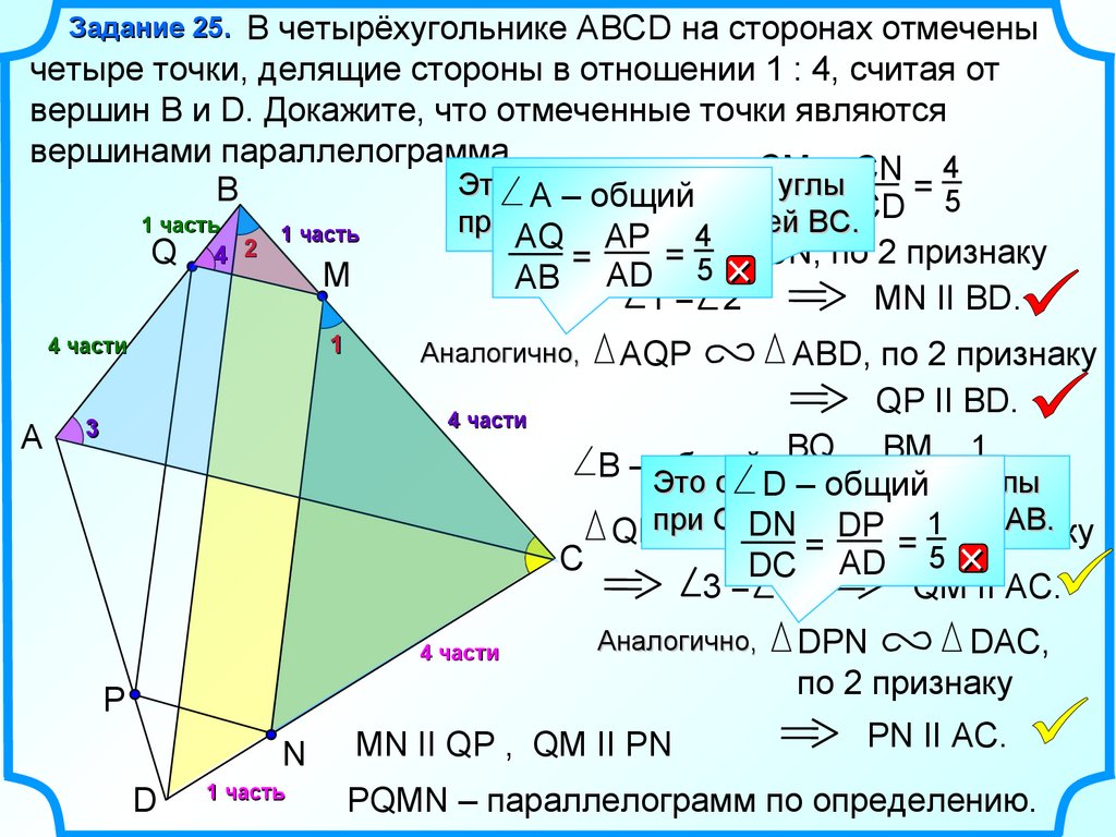 Задание 25. В четырёхугольнике АВСD на сторонах отмеченычетыре точки, делящие стороны в отношении 1 : 4, считая от