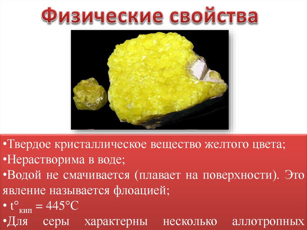 •Твердое кристаллическое вещество желтого цвета;•Нерастворима в воде;