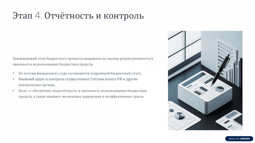Этап 4: Отчётность и контрольЗавершающий этап бюджетного процесса направлен на оценку результативности и