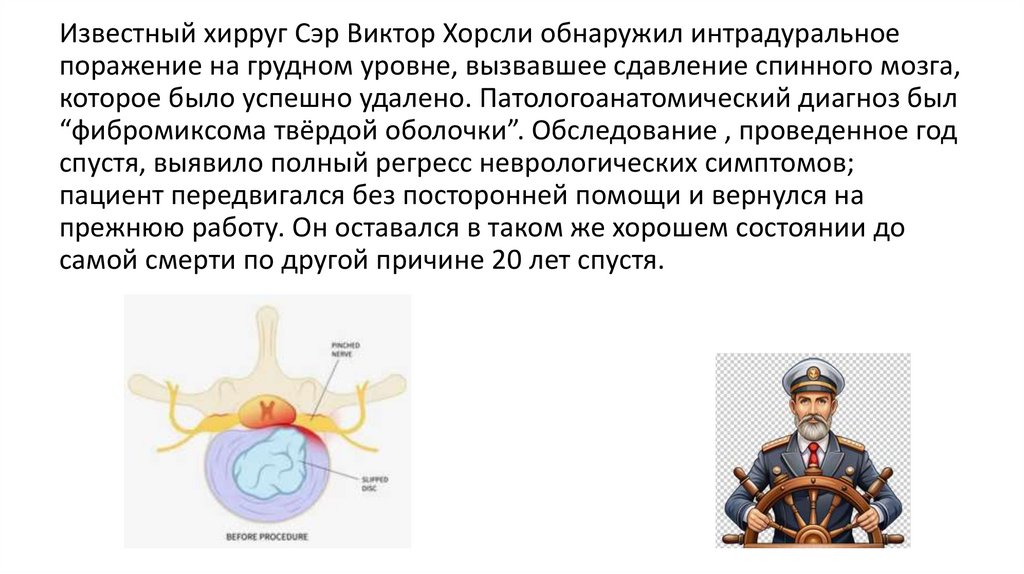 Известный хирруг Сэр Виктор Хорсли обнаружил интрадуральноепоражение на грудном уровне, вызвавшее сдавление спинного мозга,