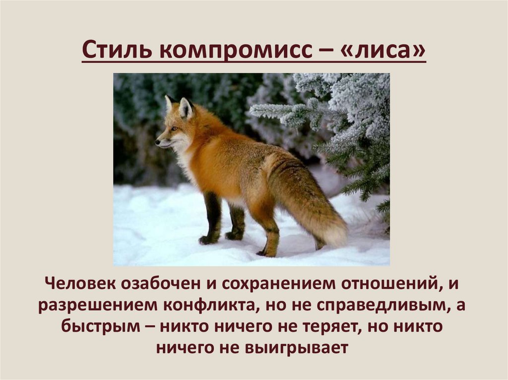 Стиль компромисс – «лиса»Человек озабочен и сохранением отношений, и