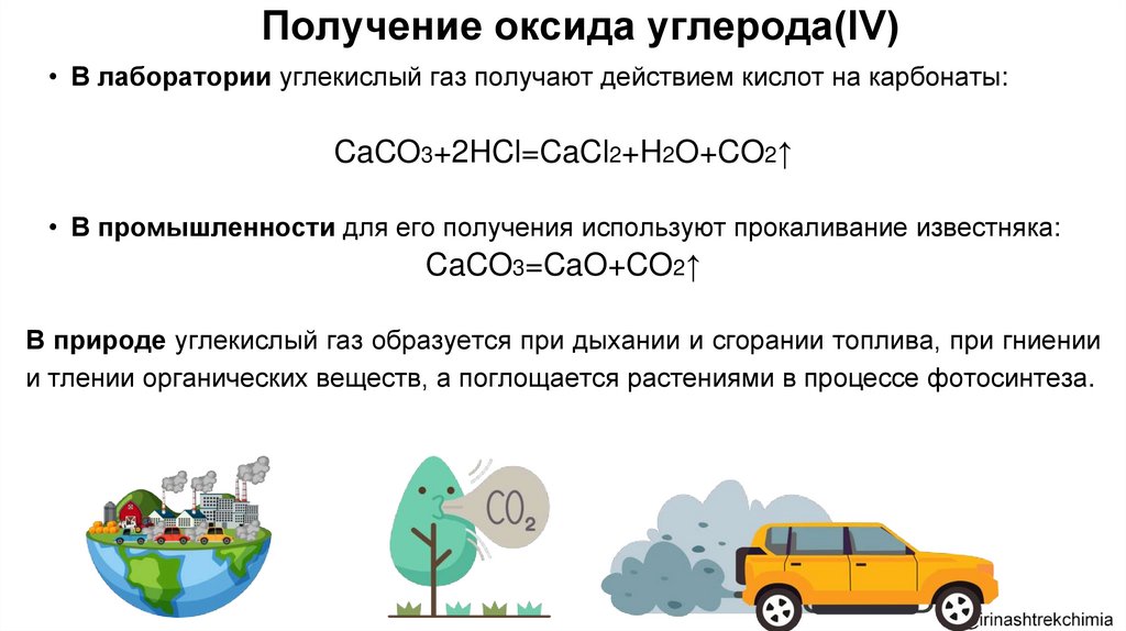 Получение оксида углерода(IV)• В лаборатории углекислый газ получают действием кислот на карбонаты: