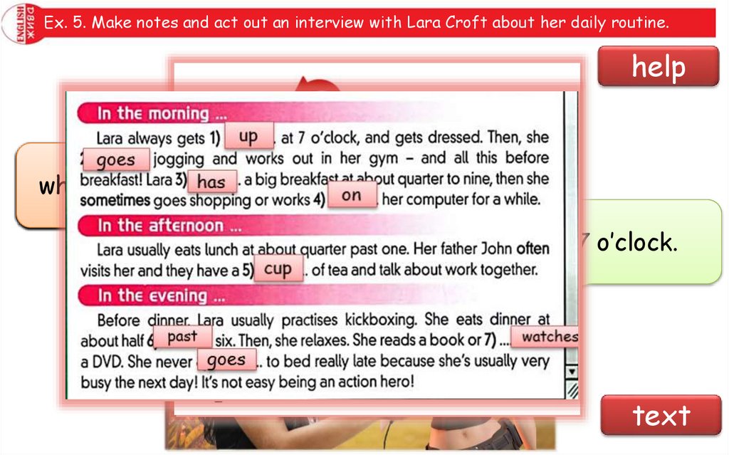 Ex. 5. Make notes and act out an interview with Lara Croft about her daily routine.help