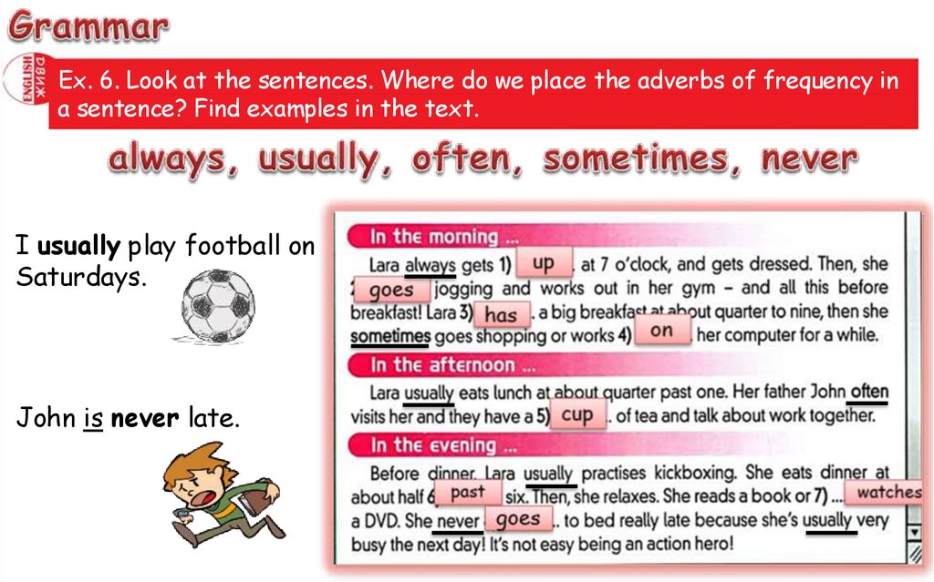 Ex. 6. Look at the sentences. Where do we place the adverbs of frequency ina sentence? Find examples in the text.