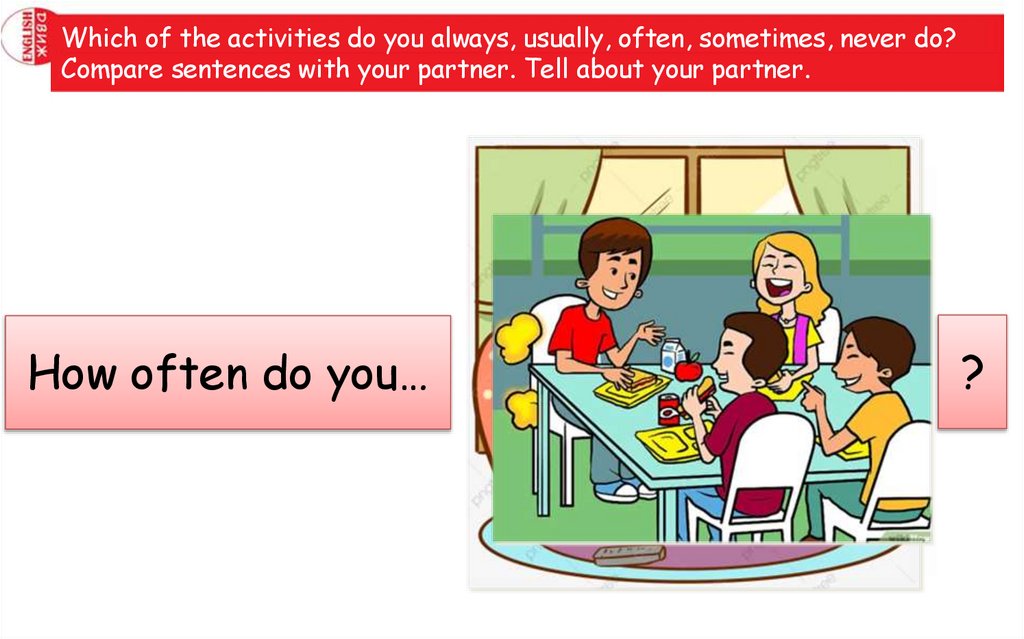 Which of the activities do you always, usually, often, sometimes, never do?Compare sentences with your partner. Tell about your partner.
