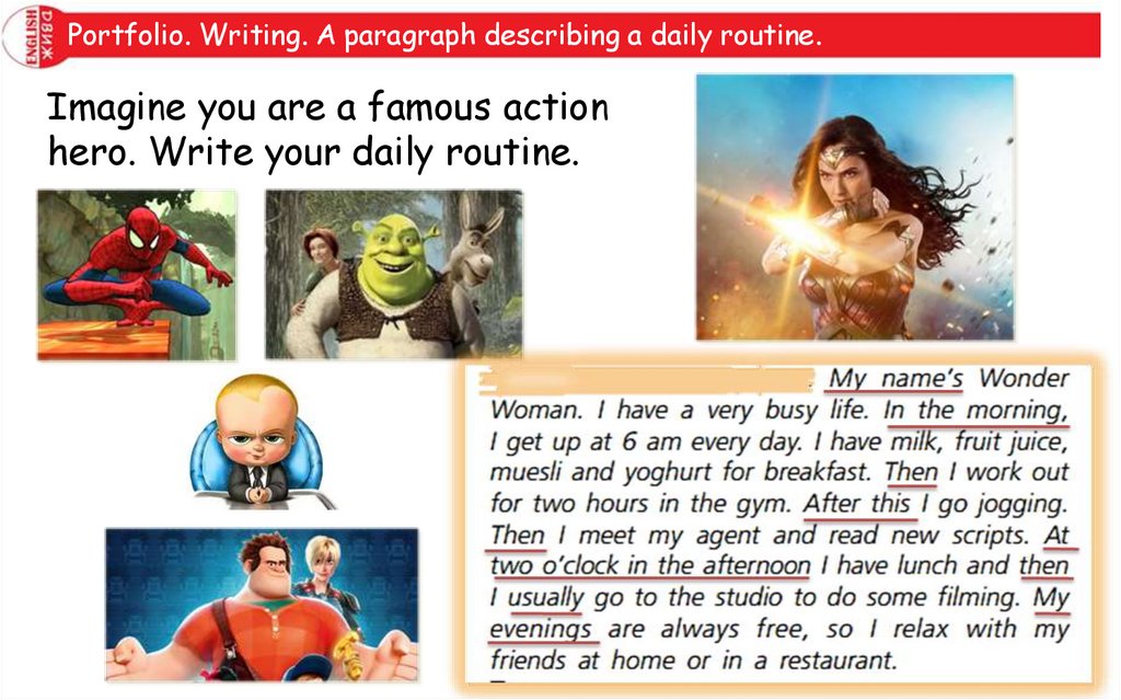 Portfolio. Writing. A paragraph describing a daily routine.Imagine you are a famous action