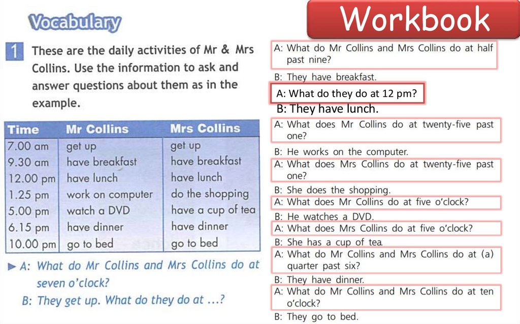 WorkbookA: What do they do at 12 pm?
