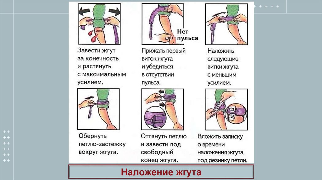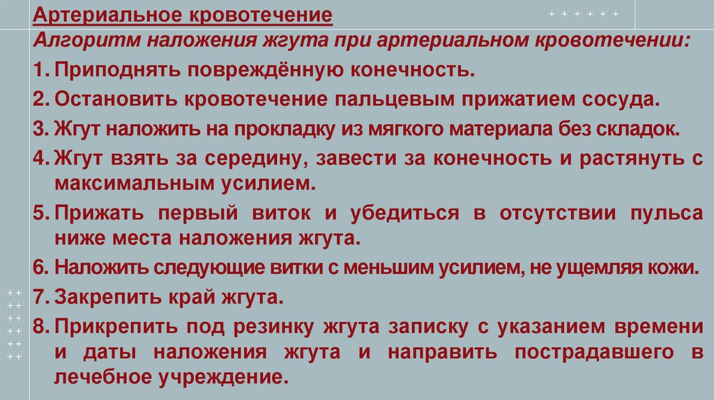 Артериальное кровотечениеАлгоритм наложения жгута при артериальном кровотечении: