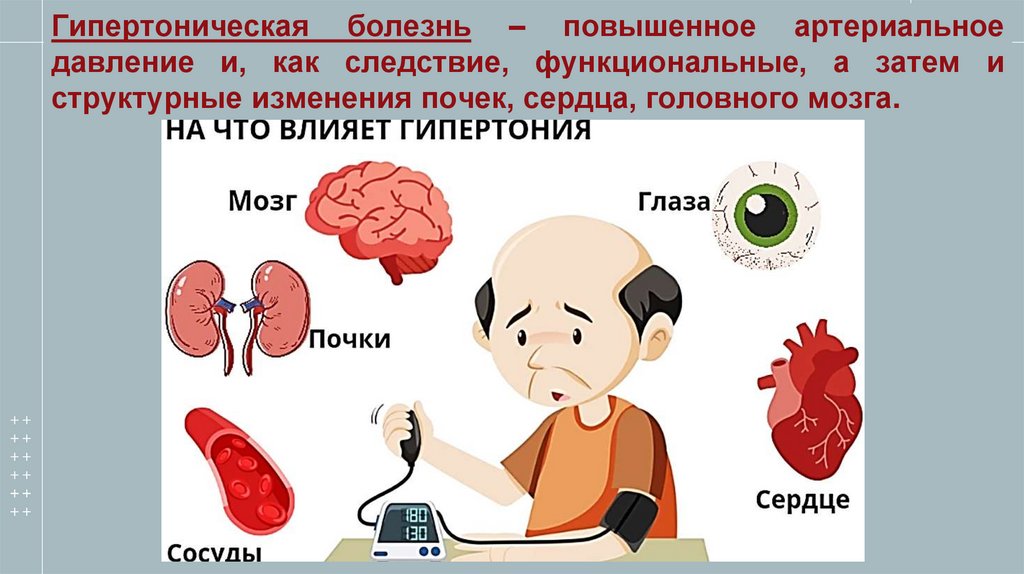Гипертоническая болезнь – повышенное артериальноедавление и, как следствие, функциональные, а затем и