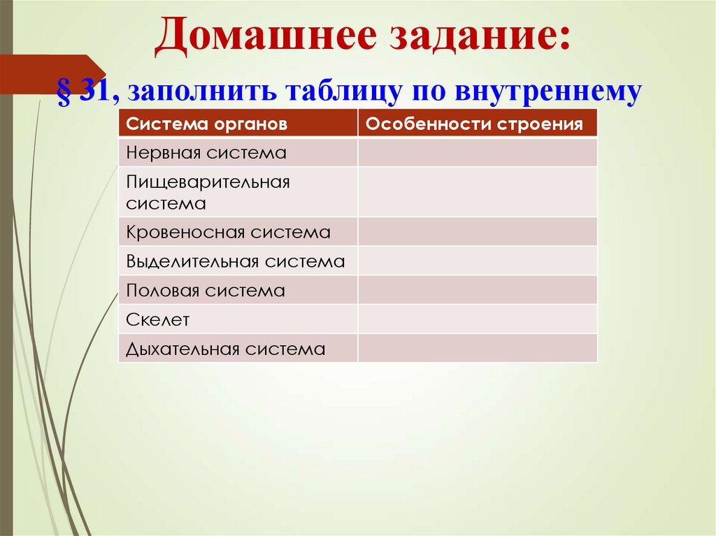 Домашнее задание:§ 31, заполнить таблицу по внутреннему
