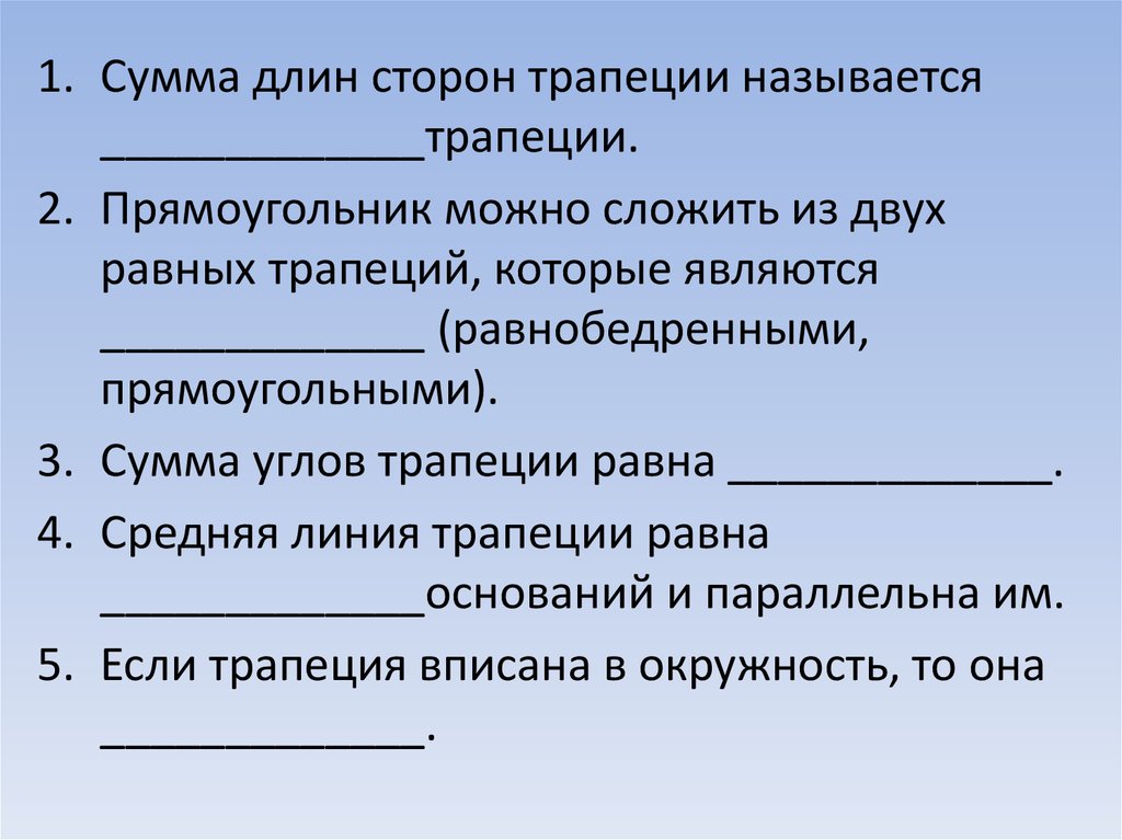 1. Сумма длин сторон трапеции называется_____________трапеции.