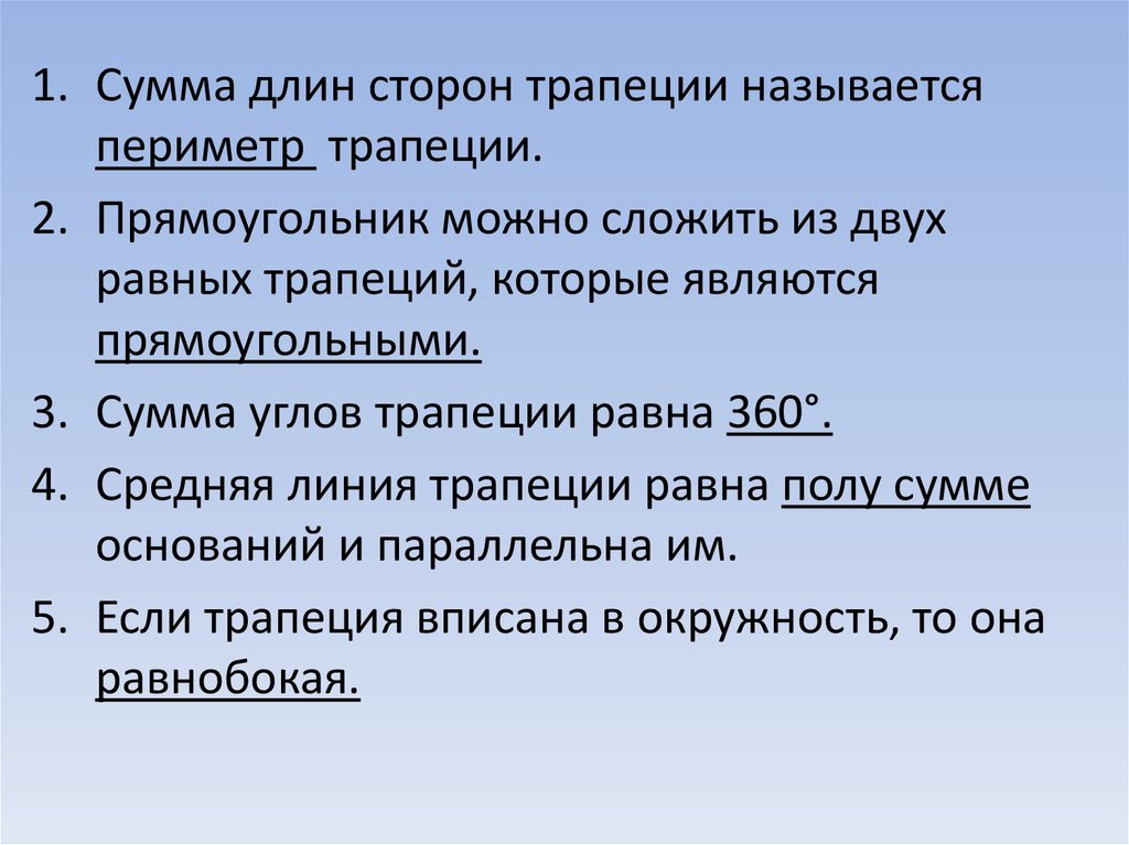 1. Сумма длин сторон трапеции называетсяпериметр трапеции.