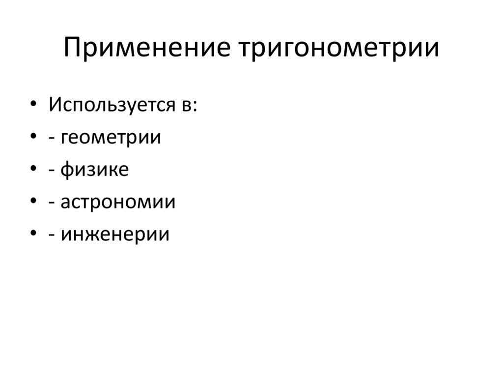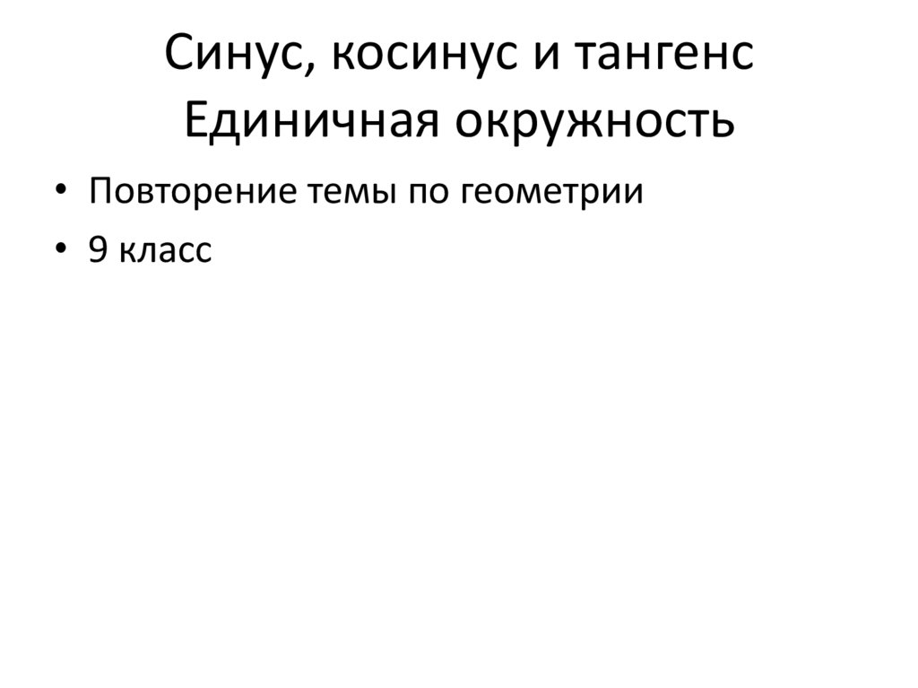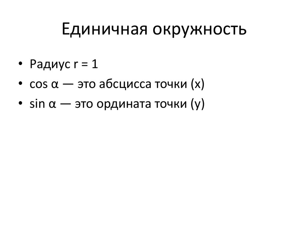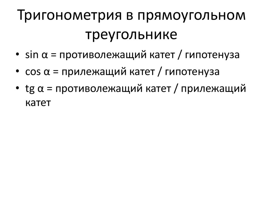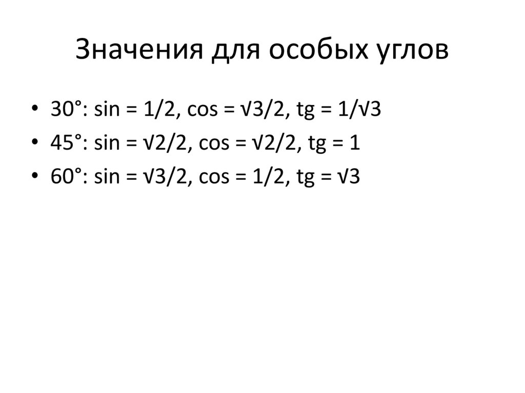 Значения для особых углов• 30°: sin = 1/2, cos = √3/2, tg = 1/√3