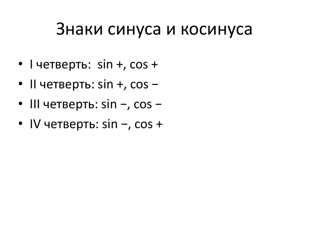 Знаки синуса и косинуса• I четверть: sin +, cos +