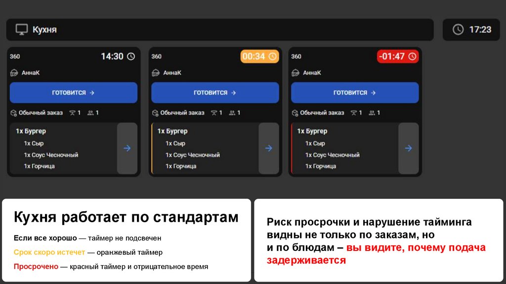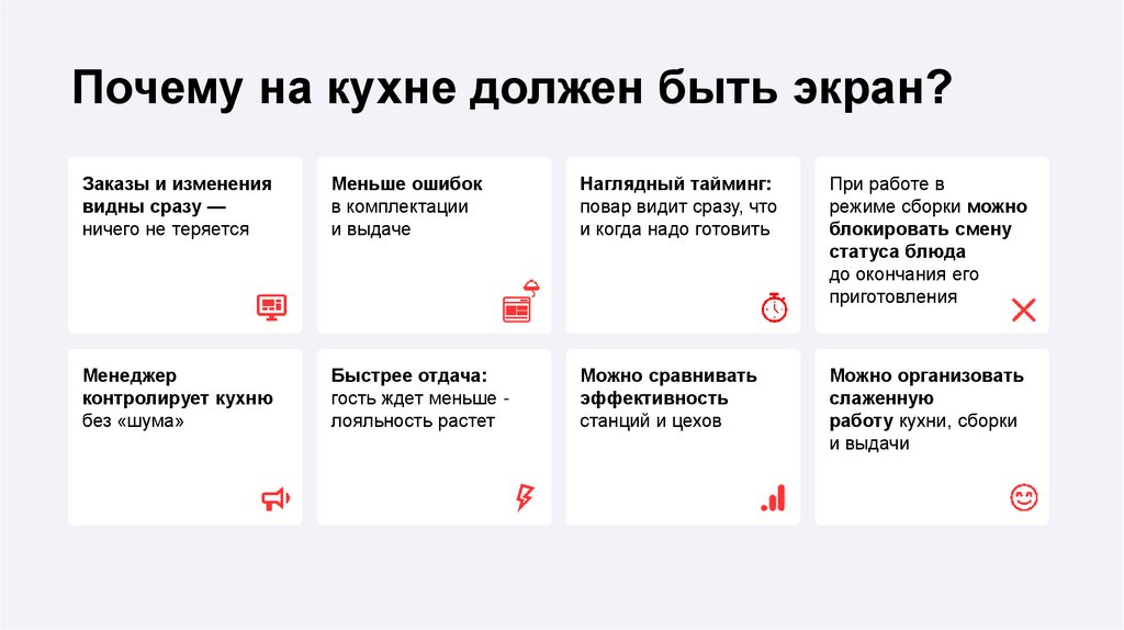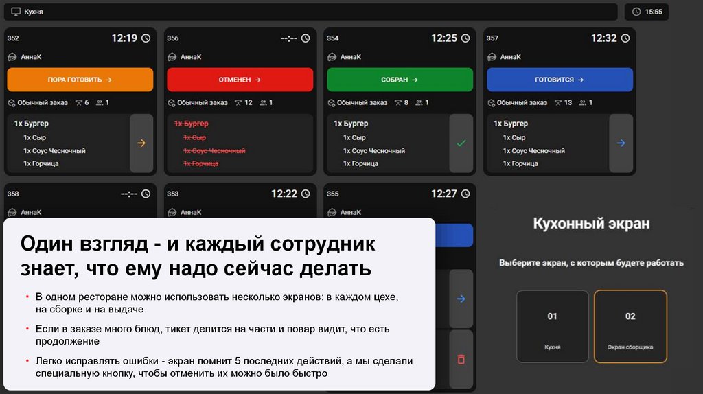 • В одном ресторане можно использовать несколько экранов: в каждом цехе,