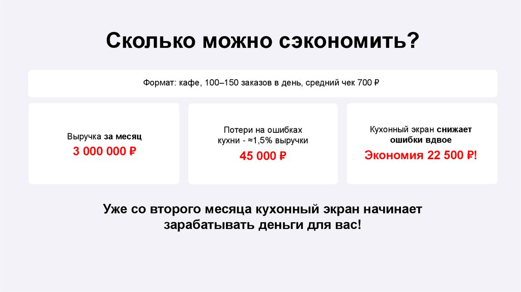 Сколько можно сэкономить?Формат: кафе, 100–150 заказов в день, средний чек 700 ₽