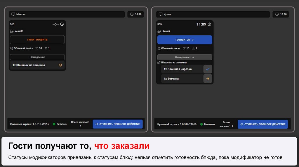 Гости получают то, что заказалиСтатусы модификаторов привязаны к статусам блюд: нельзя отметить готовность блюда, пока модификатор не готов