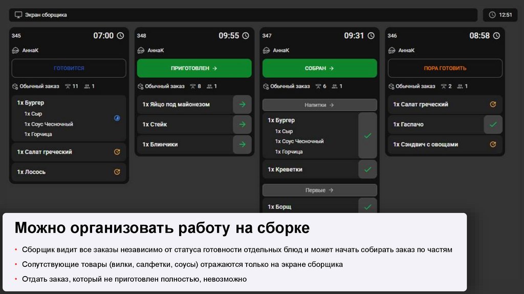 Можно организовать работу на сборке• Сборщик видит все заказы независимо от статуса готовности отдельных блюд и может начать собирать заказ по частям