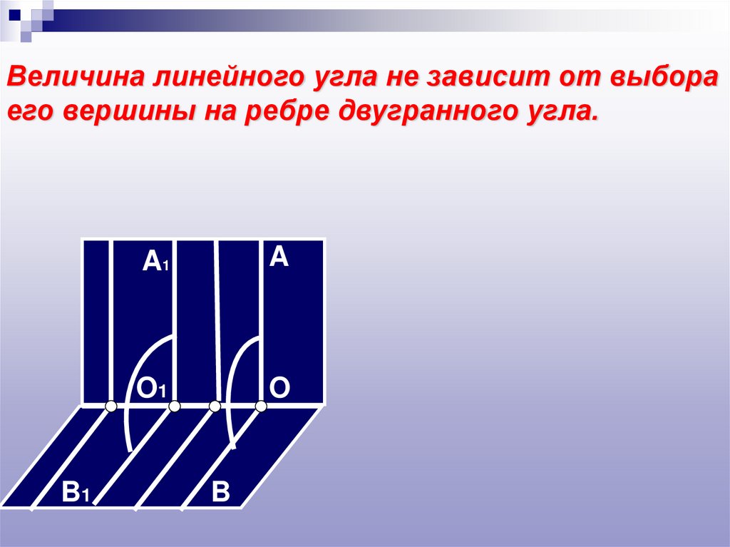 Величина линейного угла не зависит от выбораего вершины на ребре двугранного угла.