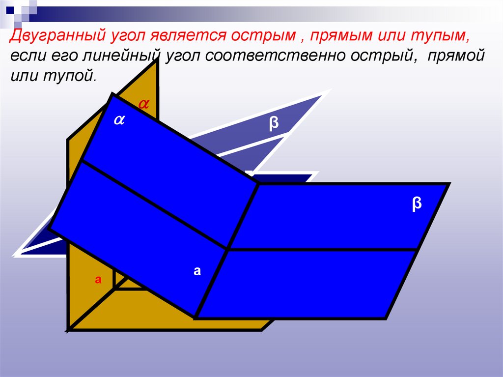 Двугранный угол является острым , прямым или тупым,если его линейный угол соответственно острый, прямой