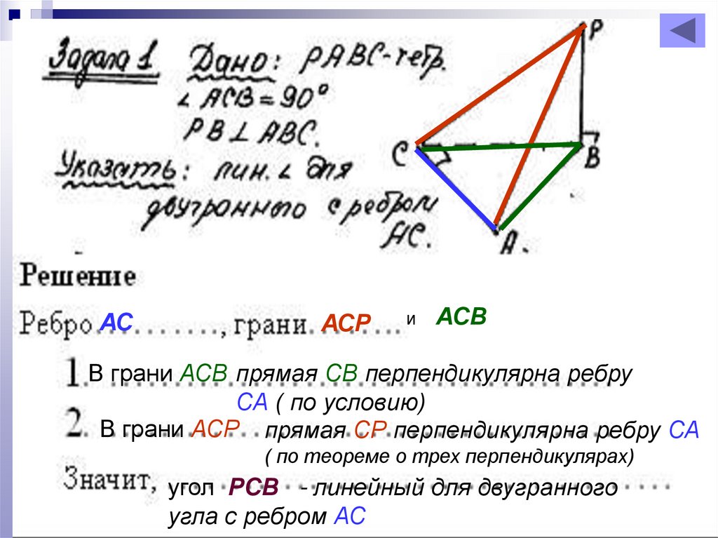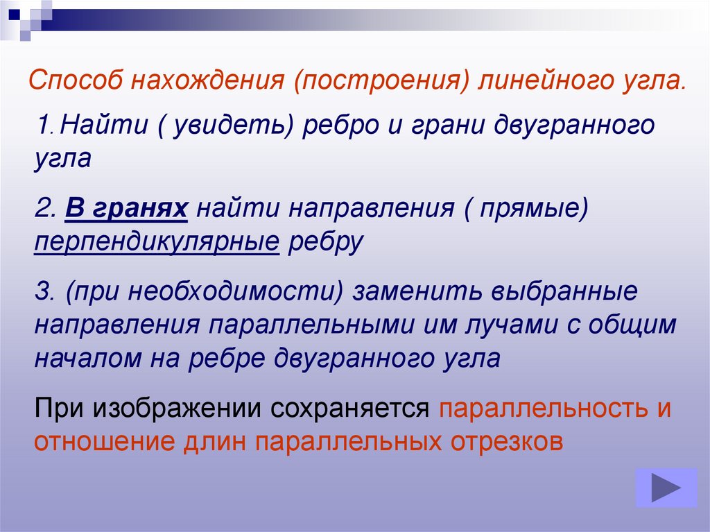 Способ нахождения (построения) линейного угла.1. Найти ( увидеть) ребро и грани двугранного