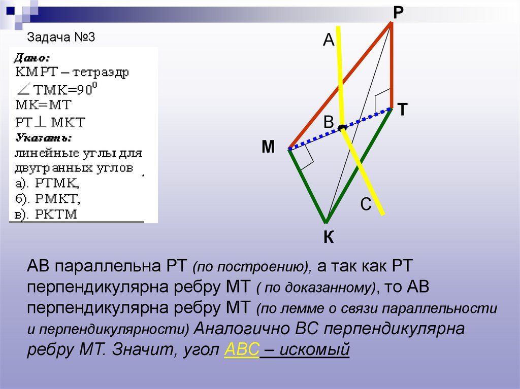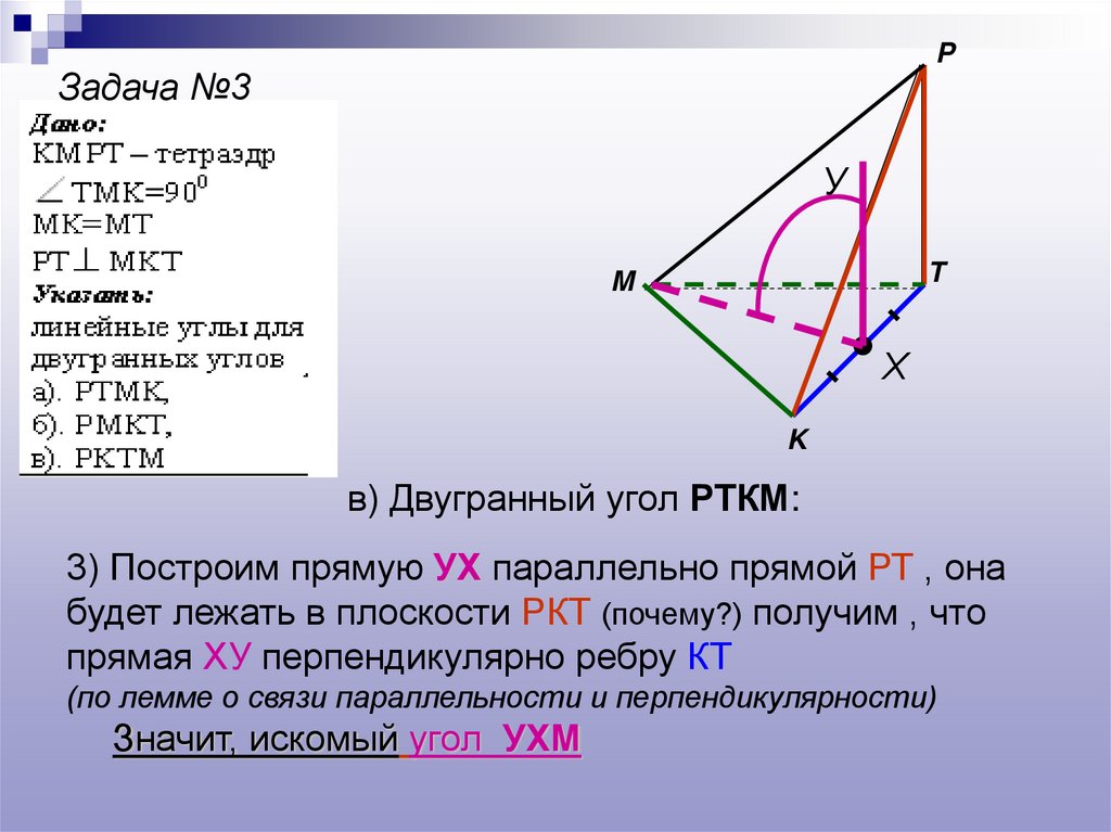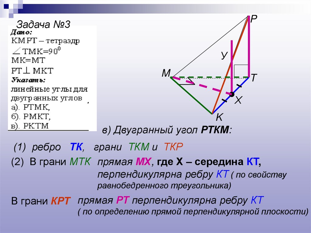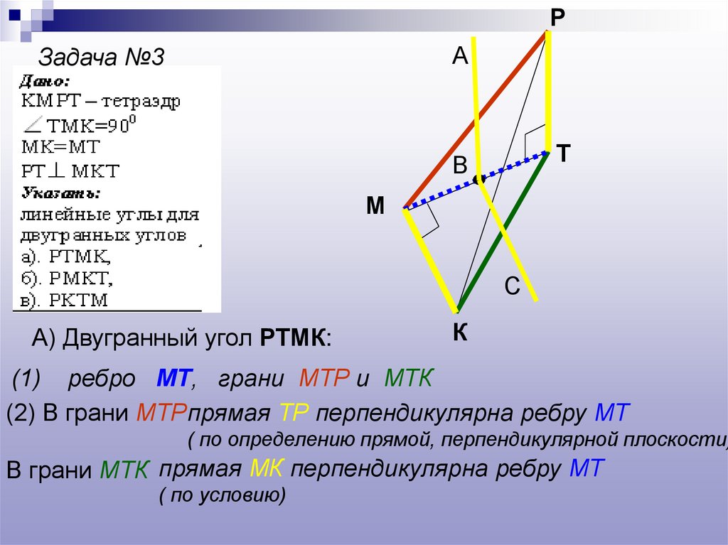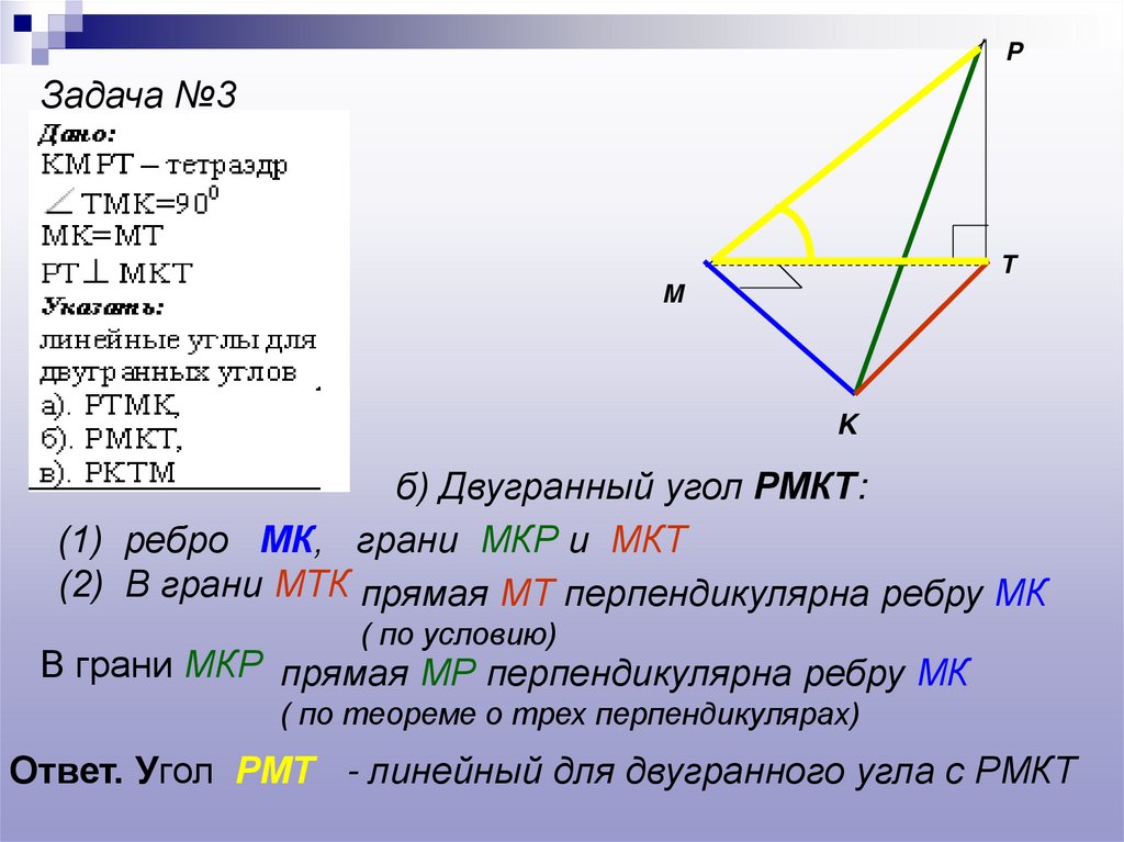 Ответ. Угол РМТ - линейный для двугранного угла с РМКТ