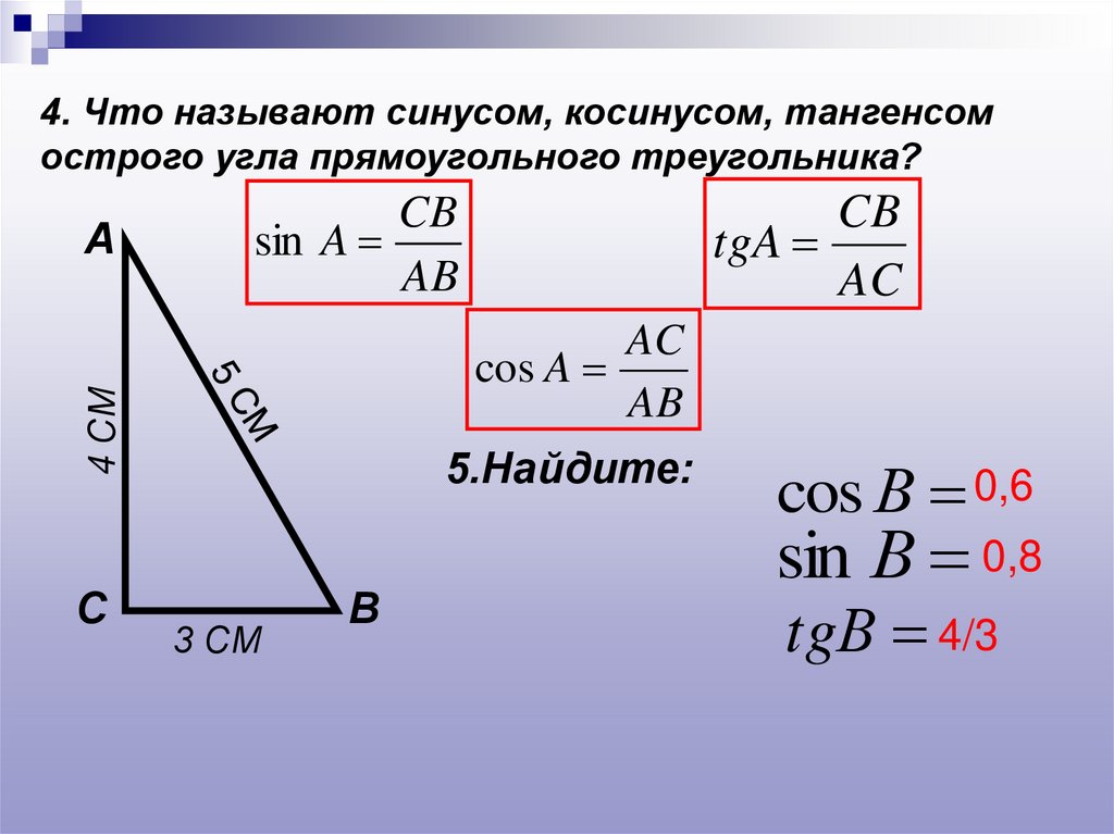 4. Что называют синусом, косинусом, тангенсомострого угла прямоугольного треугольника?