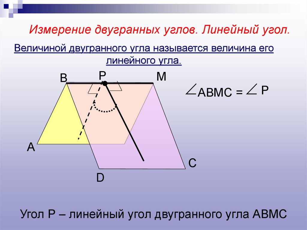 ВВЕСТИ ПОНЯТИЕ ДВУГРАННОГО УГЛА И ЕГО ЛИНЕЙНОГОУГЛА;