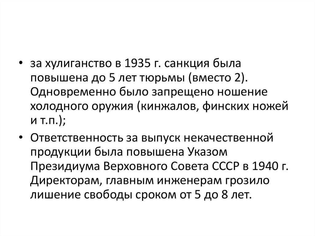 • за хулиганство в 1935 г. санкция былаповышена до 5 лет тюрьмы (вместо 2).