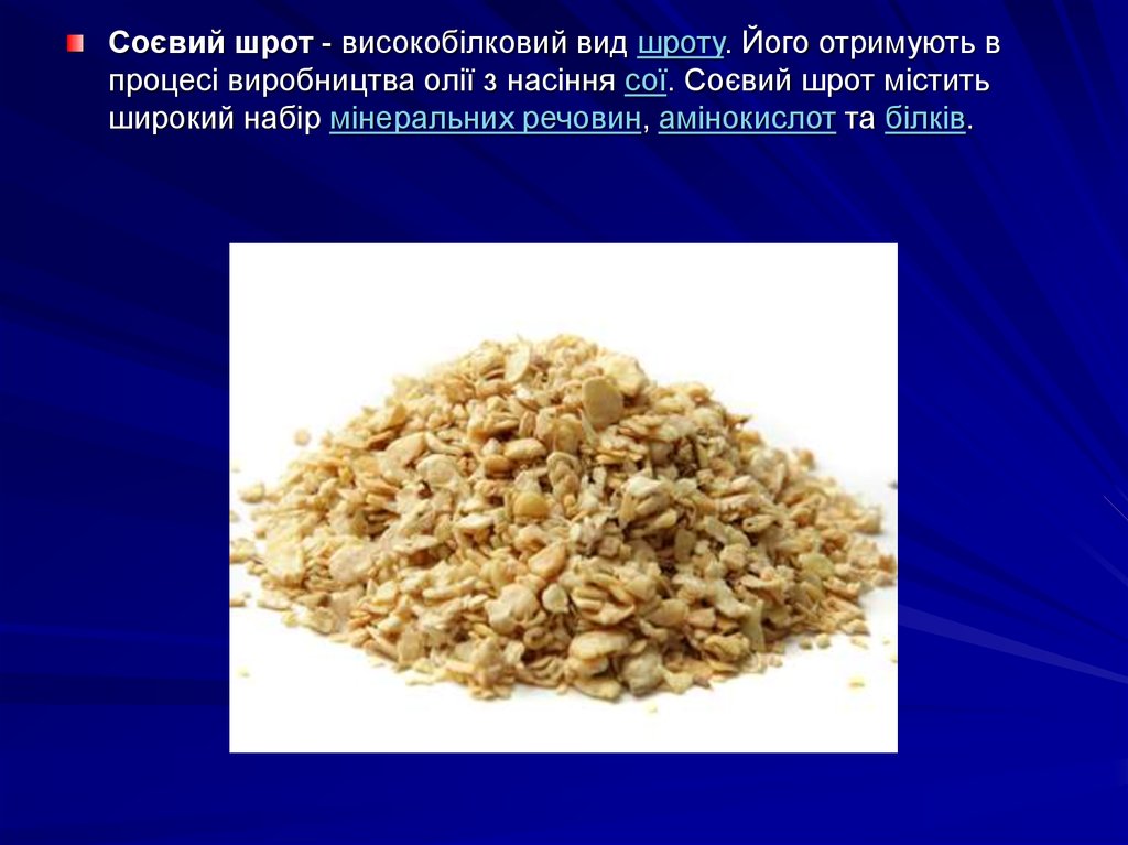 Соєвий шрот - високобілковий вид шроту. Його отримують впроцесі виробництва олії з насіння сої. Соєвий шрот містить